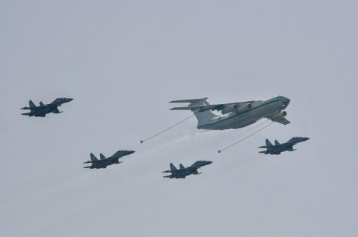 Un avión de transporte Il-76 efectuó luego un abastecimiento en pleno vuelo, escolado por dos cazas Su-30.