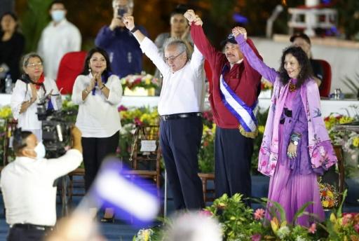 El presidente nicaragüense, Daniel Ortega, luce la banda tras asumir su cuarto mandato junto a su esposa y vicepresidenta de Nicaragua, Rosario Murillo (D), y el jefe de la Asamblea Nacional, Gustavo Porras (C), el 10 de enero de 2022 en Managua afp_tickers