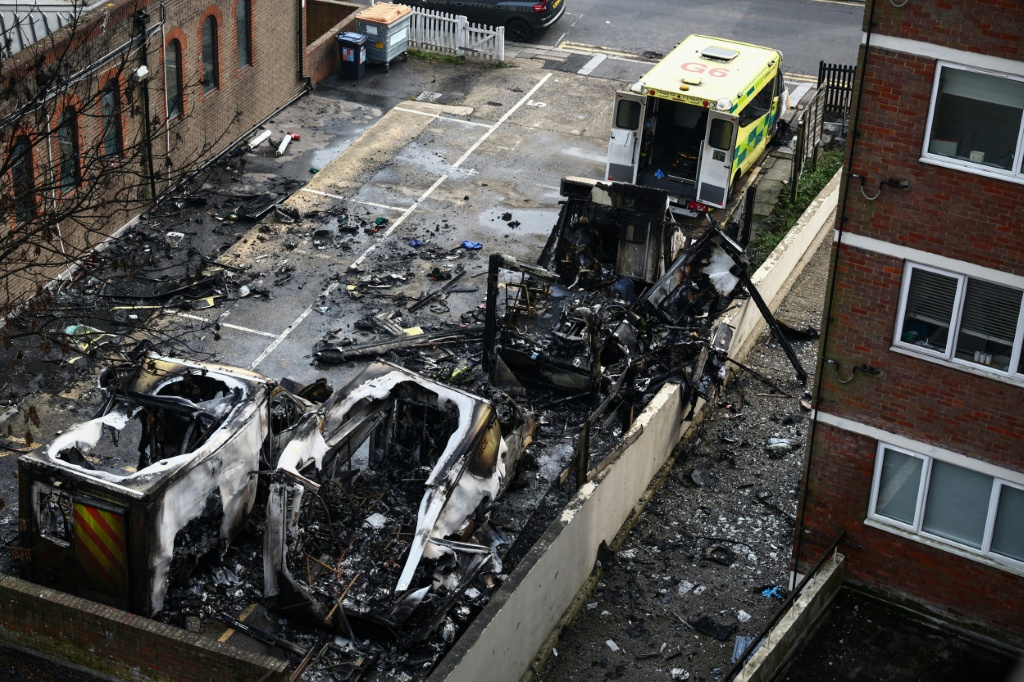Imágenes difundidas por los medios británicos muestran tres vehículos calcinados en un aparcamiento y un cuarto dañado.