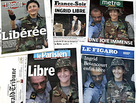 La liberación de los rehenes «es una señal de paz para Colombia», declaró Ingrid Betancourt tras su regreso a la libertad. La ex candidata a la presidencia también expresó su gratitud por el apoyo de los medios de comunicación internacionales: «Debo mucho a los medios de comunicación. Sin ellos a lo mejor ya no estuviera viva.»