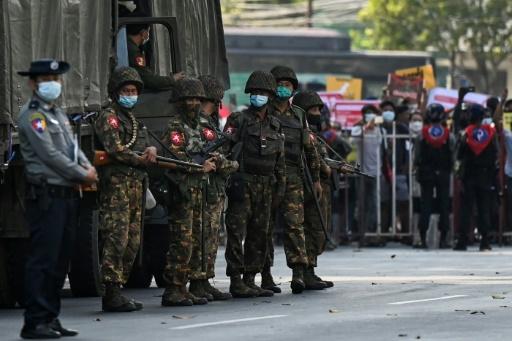 Unos soldados montan guardia durante una manifestación contra el golpe de la junta militar de Birmania, el 15 de febrero de 2021 en Rangún afp_tickers