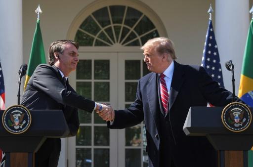 El presidente de Brasil, Jair Bolsonaro, da la mano al mandatario estadounidense, Donald Trump, el 19 de marzo de 2019 durante una visita a la Casa Blanca afp_tickers