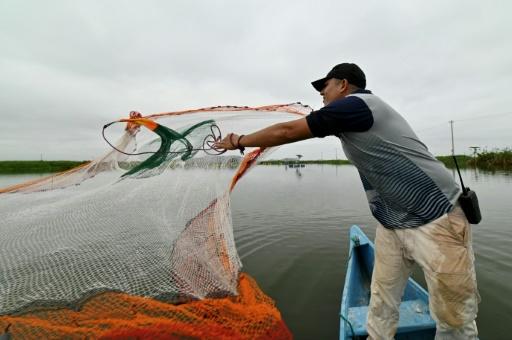 Un criador de camarones lanza su red en una piscina de cría en Taura, Ecuador, el 31 de julio de 2023 afp_tickers