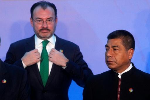 El canciller mexicano Luis Videgaray (I) y el canciller boliviano Fernando Huanacuni se preparan para la foto familiar de la Segunda Reunión Ministerial del Foro de China y la Comunidad de Estados Latinoamericanos y Caribeños (China-CELAC), en Santiago, el 22 de enero de 2018. afp_tickers