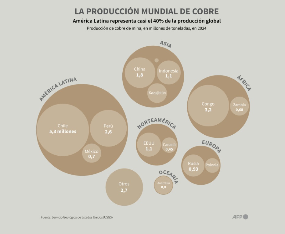 Grandes países productores de cobre, como Chile, que concentra el 24% de la oferta global, o Perú, el tercer mayor productor, se verán apenas tocados por la medida firmada el miércoles por Trump, que al poco tiempo de iniciar su segundo mandato se propuso reformar el comercio de Estados Unidos con el mundo.