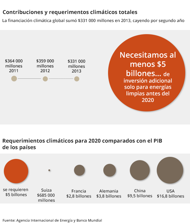 El año pasado, durante la COP celebrada en Perú, Christiana Figueres, secretaria ejecutiva de la Convención Marco de las Naciones Unidas sobre Cambio ClimáticoEnlace externo (CMNUCC), anunció que se necesitarán 90 000 millones de dólares para costear proyectos de tecnologías limpias y de infraestructura en los 15 años por venir y que el grueso de estos fondos provendrá de la iniciativa privada.