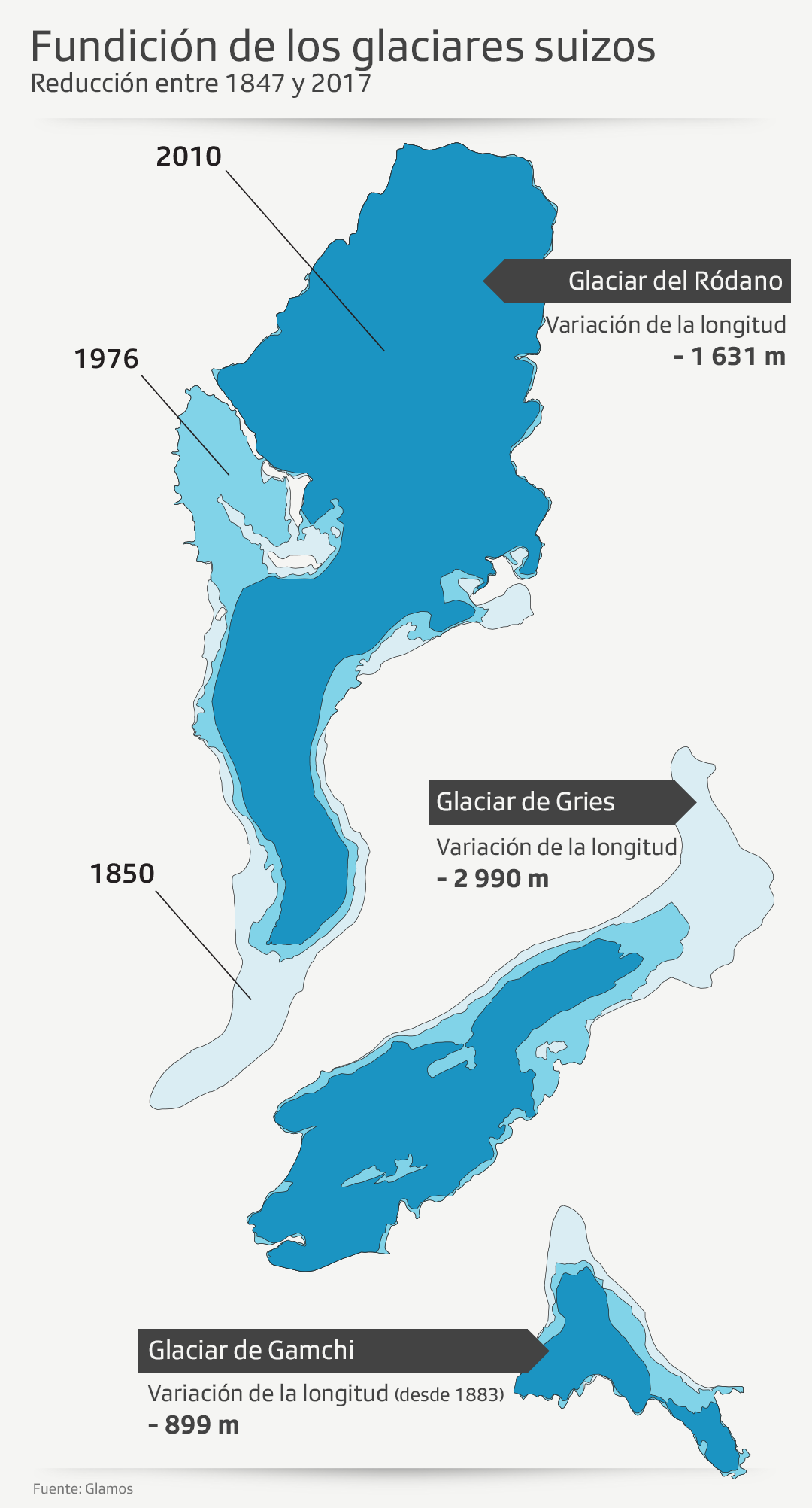 Que los glaciares se estén derritiendo no es nada nuevo: desde 1850, el volumen de los glaciares alpinos se ha reducido en un 60%. Lo que es sorprendente, sin embargo, es la velocidad a la que los “gigantes” de los Alpes se están encogiendo”.