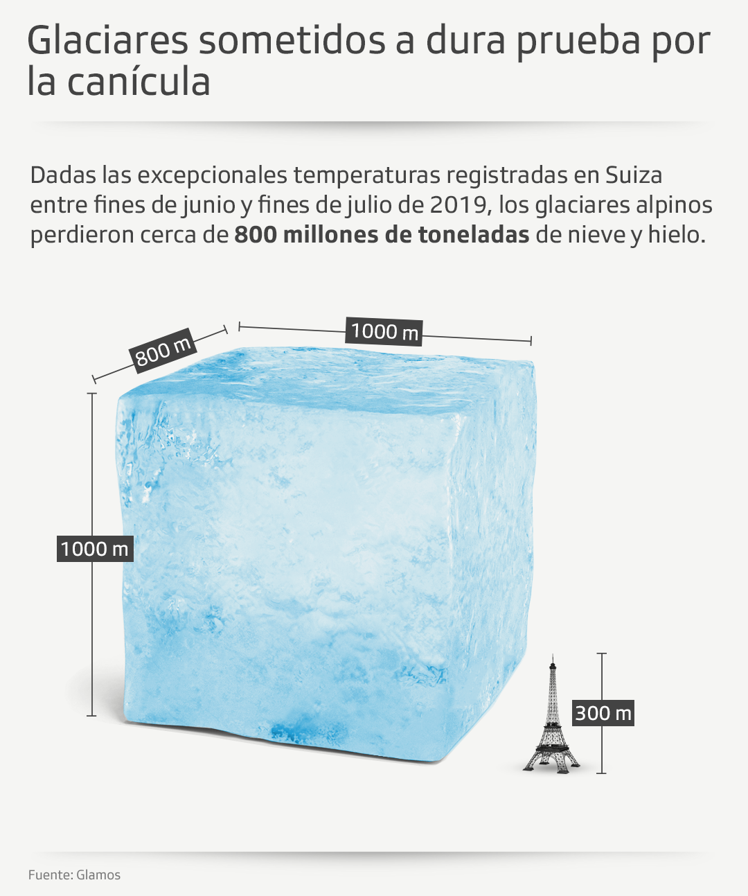 En solamente 14 días de canícula, los glaciares alpinos perdieron cerca de 800 millones de toneladas de nieve y hielo, escribe en Twitter Matthias HussEnlace externo, jefe de la Red Suiza de Monitoreo de Glaciares (GlamosEnlace externo). Esto corresponde aproximadamente a un cubo de hielo tres veces más alto que la Torre Eiffel, o la cantidad de agua potable que consume la población suiza (8,5 millones de personas) en un año, señala Huss.