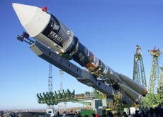 La nave con el lanzador Soyuz, antes de partir. Keystone
