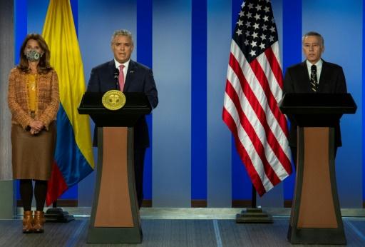 El presidente de Colombia, Iván Duque (C), con su canciller, Marta Lucía Ramírez (izq) y el embajador de EEUU Philip S. Goldberg en Bogotá el 20 de agosto de 2021 afp_tickers