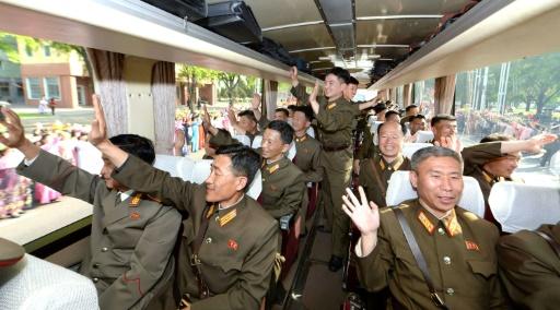 En esta foto de la agencia norcoreana KCNA, los desarrolladores del misil de mediano a largo alcance Hwasong-12 saludan a su llegada a Pyongyang el 18 de mayo de 2017 afp_tickers