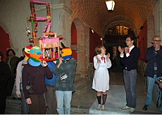 Para transmitir su mensaje Beatrice y Nicolas crearon la figura alegórica ‘El santo incómodo’ a quien deciden acudir para pedirle un milagro: la solución de este problema. Ambos caminaron acompañados por enmascarados hasta la Iglesia de San Francisco, en cuyo atrio colocaron su santo incómodo.