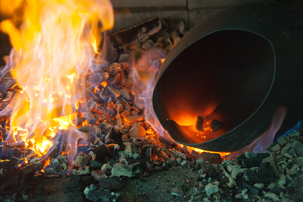 Para hacer un cencerro, Preisig corta una placa de acero que luego introduce al horno hasta que está al rojo vivo para después moldearla con un martillo. Repite ese proceso unas 20 veces. La placa de acero original se convierte gradualmente en media campana.