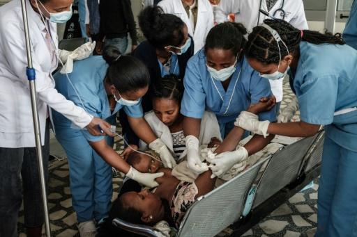 Lem Lem Hailemariam, quien se fracturó una rodilla durante un bombardeo aéreo contra un mercado en Togoga, amamanta a su bebé de tres meses mientras recibe atención médica en la entrada del hospital Ayder de Mekele, en Etiopía, el 24 de junio de 2021 afp_tickers