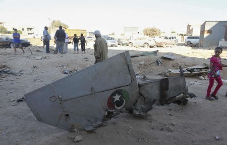 Un resto de un avión MIG del Gobierno derribado durante un enfrentamiento en Bengazi, jul 29 2014. Milicias libias rivales que luchan por el control del aeropuerto de Trípoli acordaron el miércoles un cese al fuego temporario para permitir que los bomberos intenten controlar un enorme incendio en un depósito de combustible impactado por un misil. REUTERS/Esam Omran Al-Fetori reuters_tickers