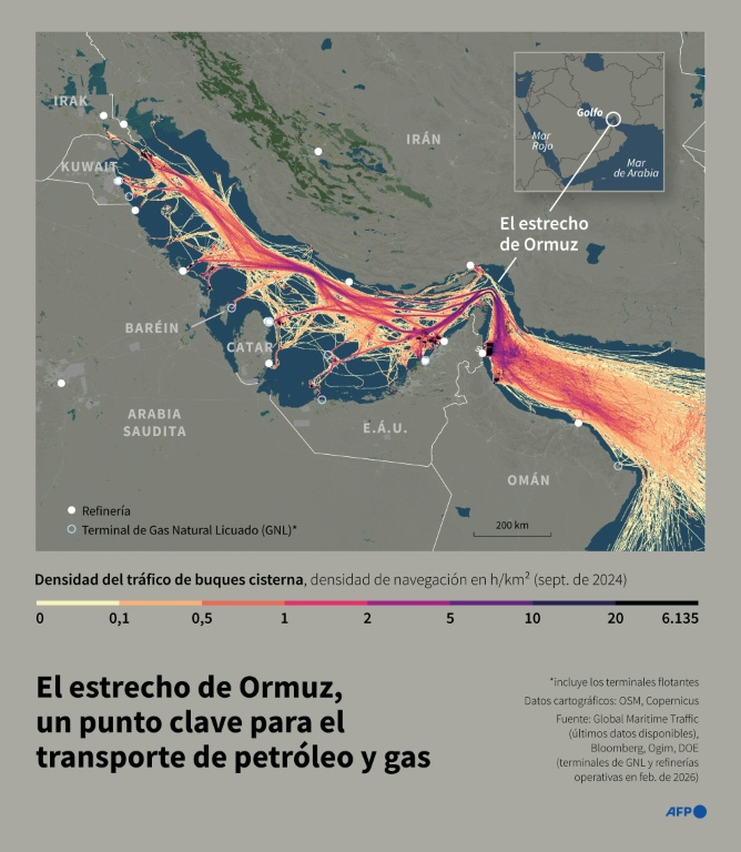 Irán controla la orilla norte del estratégico estrecho de Ormuz, un paso clave a nivel mundial para el tráfico de petróleo y gas natural licuado, lo que hace de este país un actor principal en el comercio mundial de hidrocarburos.