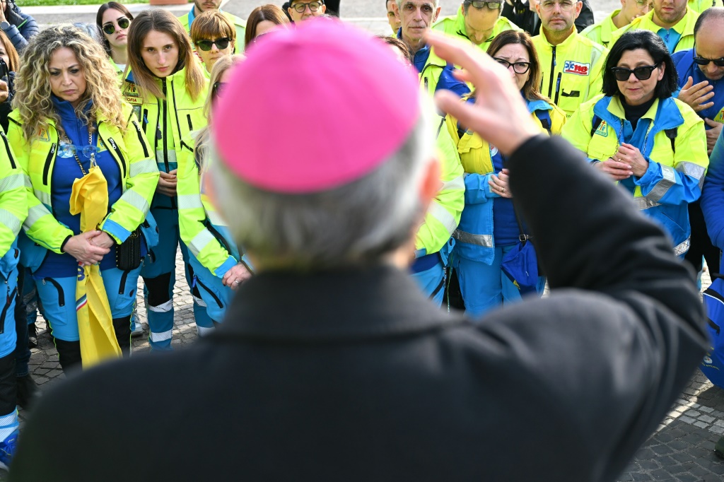 Varios grupos de voluntarios de la protección civil italiana y de la asociación católica Misericordie d’Italia, del que Agostinelli ejerce como su capellán nacional, se han sucedido durante la tarde a las puertas del hospital para orar por su «Santo Padre».