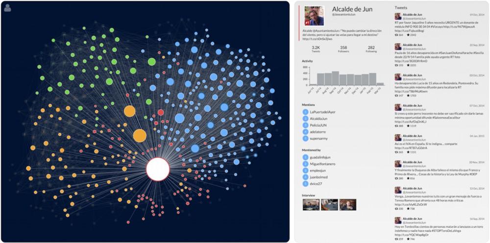 No tenemos las respuestas aún, pero un ‘mapping’ inicial de los datos de Twitter ha permitido abrir una nueva ventana sobre la realidad de Jun. En las capturas de pantalla de más abajo donde se muestra un explorador de datos desarrollado por Martin SaveskiEnlace externo, estudiante de postgrado en el Laboratorio de Máquinas Sociales, cada círculo representa a un ciudadano u organización de Jun. Las líneas entre los círculos representan las relaciones entre los seguidores de Twitter. Cuanto más grande es el círculo, más “importante” es la posición que ocupa esa persona en la red (utilizamos PageRank de Google para medir la importancia en Twitter, aunque esta no es la única significativa en la comunidad). Los cuatro colores denotan diferentes subredes de personas en Jun que están muy vinculadas entre sí debido a su actividad en Twitter. En cada gráfico, se resaltan las conexiones personales de un ciudadano en concreto (el círculo blanco) y se muestran más detalles sobre esa persona en el recuadro de la derecha. La primera captura se centra en el alcalde, la segunda, en el electricista.
