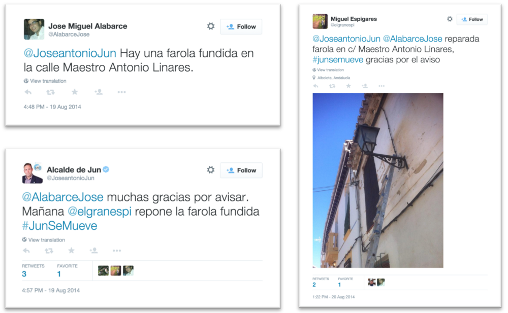 En el día a día, un escenario muy común es el de un ciudadano que tiene una pregunta, solicitud o queja y envía un tuit al alcalde o al personal del ayuntamiento encargado de resolver el asunto. Por ejemplo, la secuencia de tuitsEnlace externo mostrada abajo, que extrajimos de los datos de Twitter de 2014, refleja cómo a las 10:48 de la noche un vecino le dice al alcalde que la farola de la calle Maestro Antonio Linares está fundida. Nueve minutos más tarde, el alcalde responde que el electricista se ocupará de ello al día siguiente. En el tuit, el alcalde incluye el nombre de usuario del electricista, al que se le notifica de forma automática que ha sido mencionado y ve el diálogo. Este tuit es un compromiso público de que el ayuntamiento tomará cartas en el asunto y, para subrayarlo, concluye con la etiqueta #JunSeMueveEnlace externo. Al día siguiente, el electricista tuitea una foto de la farola arreglada, agradeciéndole al ciudadano su tuit y repitiendo la etiqueta.
