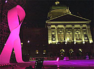 Para marcar el inicio de la campaña, la Plaza Federal del centro de Berna, frente a la sede del Parlamento y del Gobierno, fue iluminada anoche (2.10.) de color rosa, así como numerosos monumentos en todo el mundo.