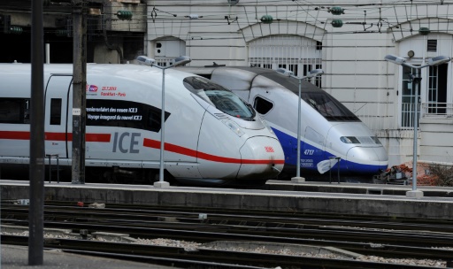 El nuevo tren Ice 3 del operador alemán de ferrocarriles Deutsche Bahn (izqda) y el tren TGV de la compañía francesa nacional SNCF llegan a la vez a estación de trenes de Gare de l'est, en París, el 23 de julio de 2015 afp_tickers