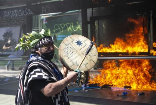 Con ropas e instrumentos musicales tradicionales decenas de representantes indígenas marcharon hacia Plaza Italia, epicentro de las protestas por mejoras sociales y políticas que han sacudidos desde el año pasado a la capital chilena.