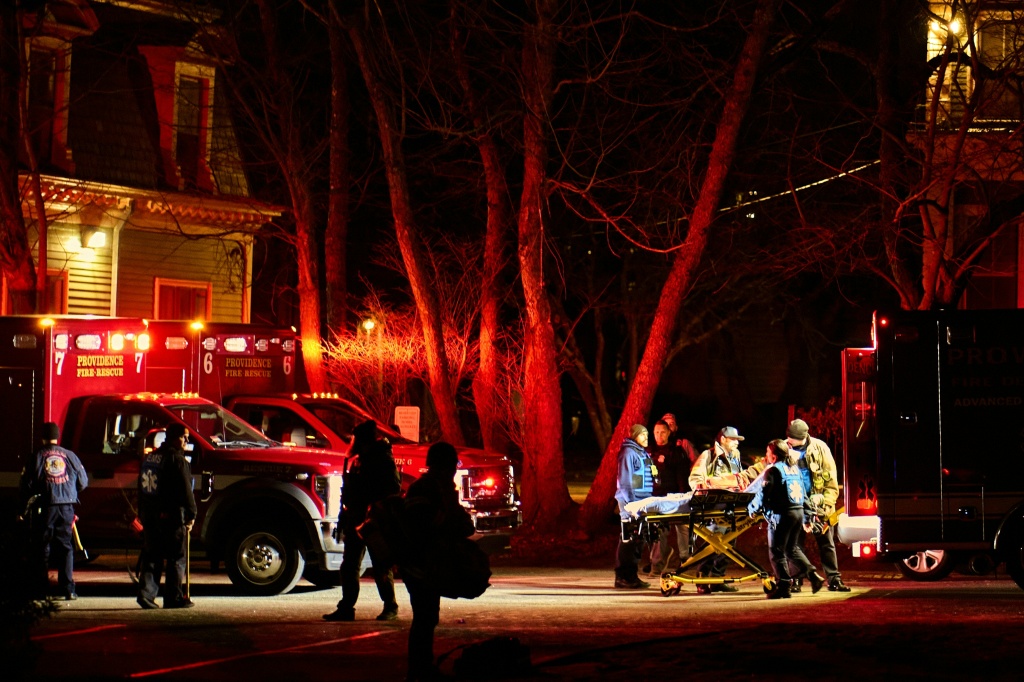 En Providence, las calles alrededor de la universidad se llenaron de vehículos de emergencia horas después de que el tirador abriera fuego el sábado en un edificio donde se estaban realizando exámenes.