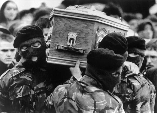 Unos militantes del Ejército Republicano Irlandés (IRA) llevan el féretro de su líder Bobby Sands, fallecido durante una huelga de hambre en la Prisión de Maze (Irlanda del Norte), a un cementerio en Belfast, el 7 de mayo de 1981 afp_tickers