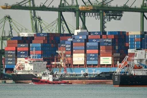 Un barco pequeño pasa junto a portacontenedores en la terminal portuaria Pasir Panjang de Singapur, el 3 de enero de 2023 afp_tickers