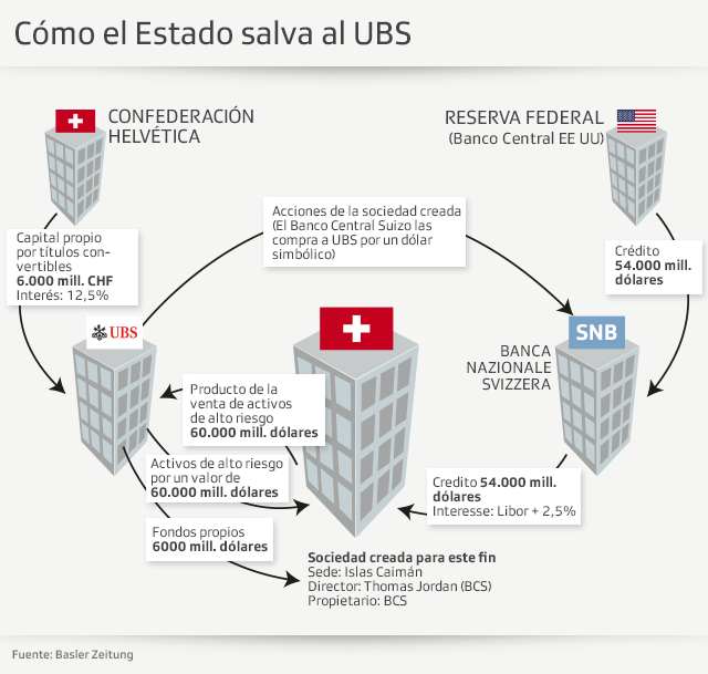 El 16 de octubre, el Gobierno suizo y el BNS anunciaba un plan para salvar al UBS del naufragio: el Estado destinaba 6 000 millones de francos para restablecer los fondos del propio banco y el banco central, 54 000 millones de dólares para que el UBS pudiera transferir a un fondo especial los títulos ilíquidos, a la espera de tiempos mejores para poder revenderlos. Estos títulos se “aparcaron” en una “sociedad vehículo” que creó el BNS en las Islas Caimán.