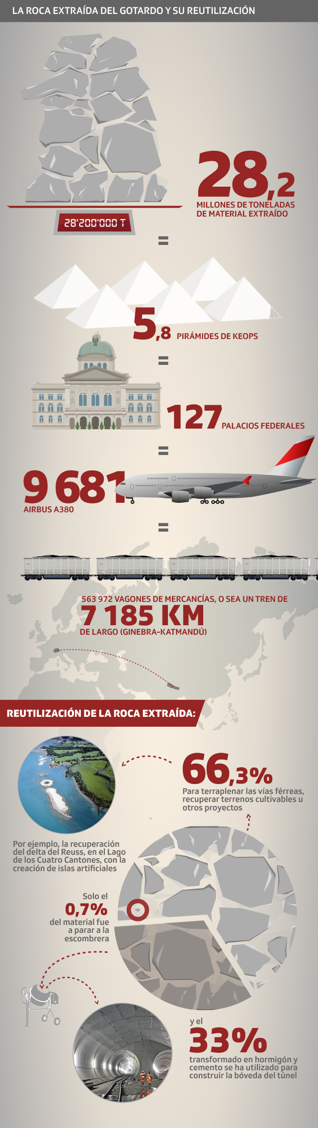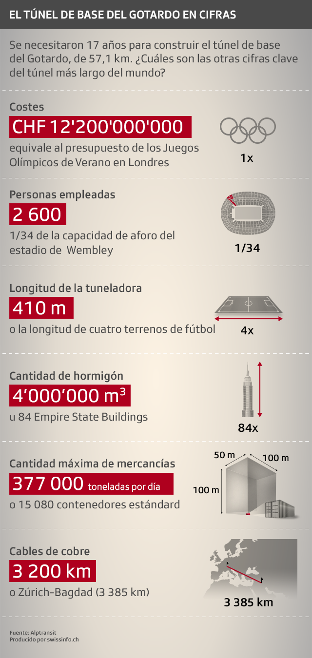 Diecisiete años de obras, una inversión de 12 000 millones de francos, 28 millones de toneladas de roca excavada de la montaña y 57 km de longitud. Estas y otras cifras clave del túnel ferroviario más largo del mundo ilustradas en infografías y animaciones realizadas por swissinfo.ch y el ente público suizo SRG SSR.