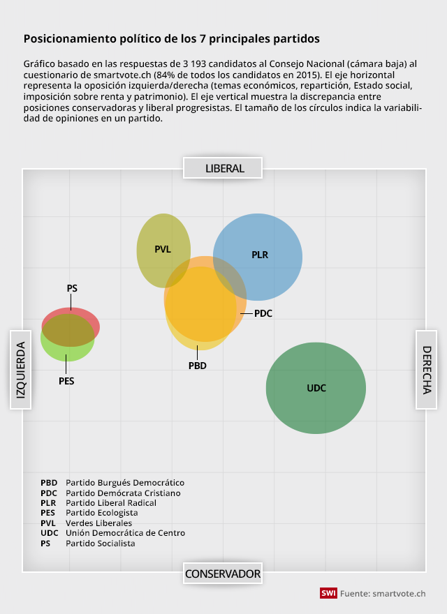 Los gráficos siguientes muestran las posiciones de los siete principales partidos políticos, según la plataforma smartvote.ch