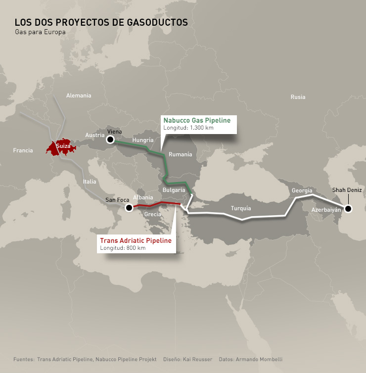 Dos consorcios –Trans Adriacti Pipeline y Nabucco Gas Pipeline – compiten por el eslabón que falta: el gasoducto que traerá metano de Turquía a Europa central y occidental. En junio próximo se decidirá cuál de los dos gasoductos se hace con el proyecto.