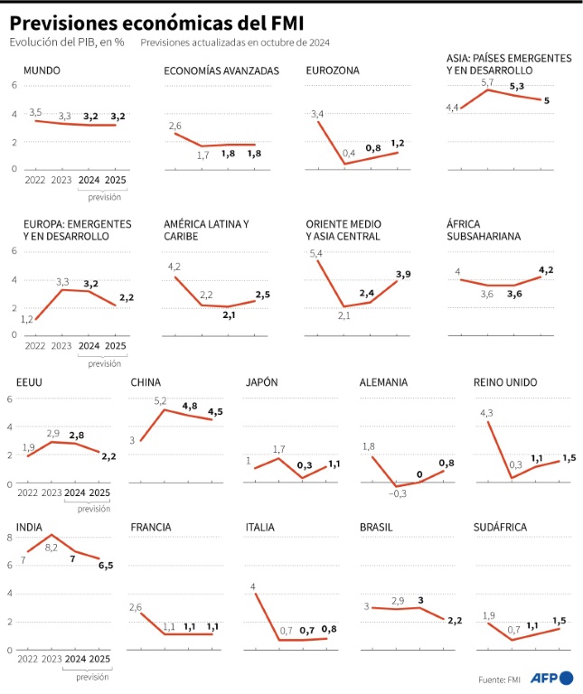 El motor de la zona euro, Alemania, sufrió particularmente el shock de la guerra en su economía y entró en recesión el año pasado. Su PIB se estancará este año, y tendrá un modesto avance de 0,8% el próximo según las previsiones del Fondo publicadas el martes y revisadas en fuerte baja sobre las de julio (0,2 puntos porcentuales para 2024 y 0,5 para 2025).