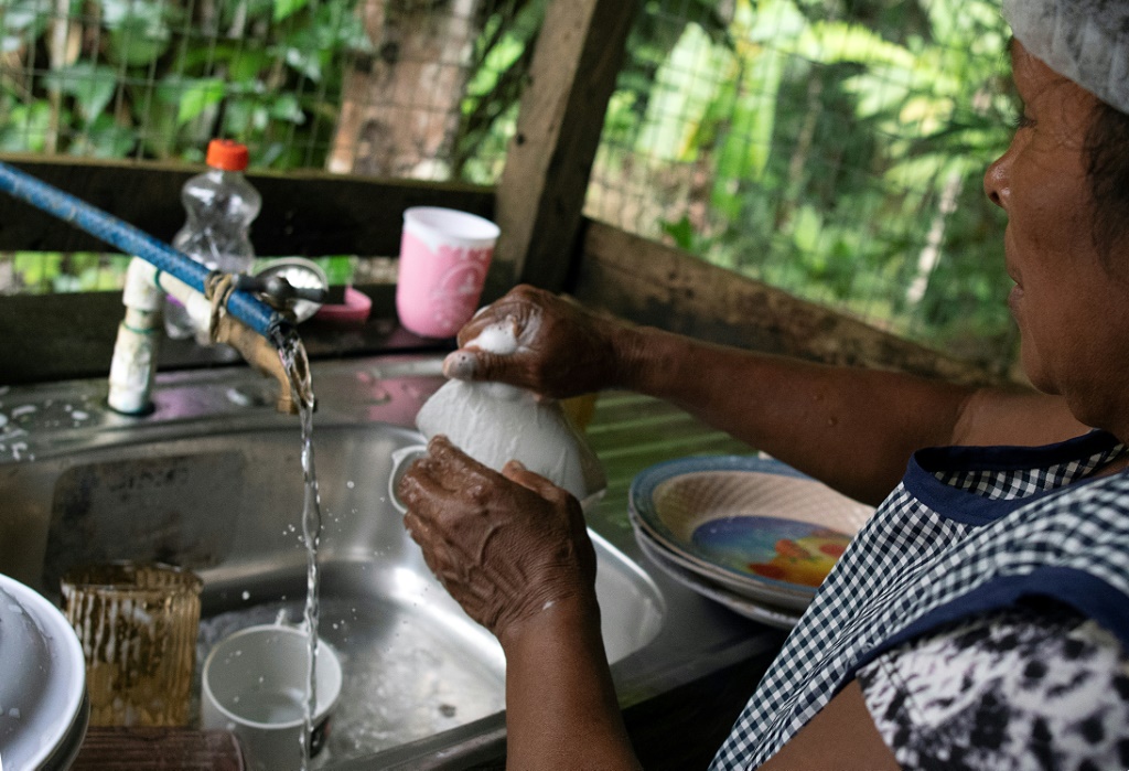 Mientras lava la loza con agua limpia que sale del grifo, la mujer de 54 años resalta lo «bonito» que es «tener agua en las casas» y «no tener que ir lejos a traerla».