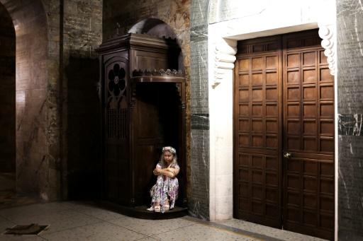 Una mujer, sentada en un confesionario, escucha un concierto de órgano en la Basílica de Nuestra Señora del Rosario del Santuario de Lourdes, en Francia, el 14 de agosto de 2023, durante la celebración de la Asunción afp_tickers