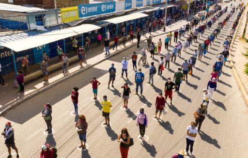 Esta foto de archivo del 29 de abril muestra el distanciamiento social para entrar a un mercado en Piura, Perú afp_tickers