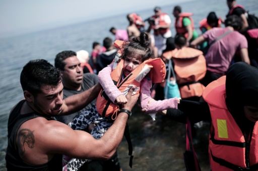 Un refugiado saca a una niña de un barco recién llegado a las costas griegas de Lesbos desde Turquía, el 3 de septiembre de 2015. A los riesgos de una travesía incierta hacia Europa, muchos inmigrantes suman traumas psicológicos difíciles de curar afp_tickers
