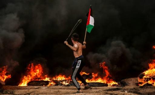 Un manifestante palestino lanza piedras ante unos neumáticos ardiendo durante enfrentamientos contra las fuerzas israelíes, cerca de la forntera israelí con Gaza afp_tickers