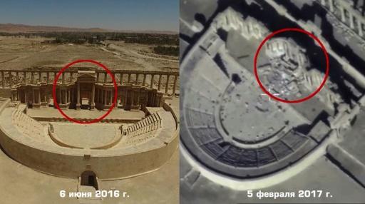 «Estas imágenes muestran claramente que los terroristas han destruido el proscenio, la parte central del antiguo teatro romano, y las columnas del Tetrápilo», señaló el ministerio ruso de Defensa en un comunicado.