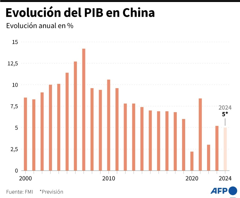 «Se prevé que el crecimiento económico de China se mantenga resiliente en 5% en 2024, y desacelere a 4,5% en 2025», indicó el FMI en un comunicado.