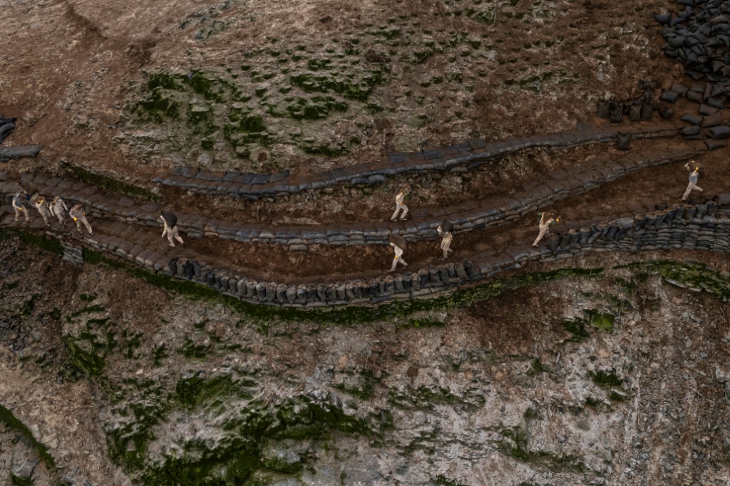 Llevan trajes blancos y mascarillas quirúrgicas. Realizan su trabajo en medio de una persistente nube de polvo acre. A paso acelerado conducen los pesados sacos a través de la isla de 130 hectáreas por laderas de acantilados, en senderos empinados bajo las ráfagas de viento.