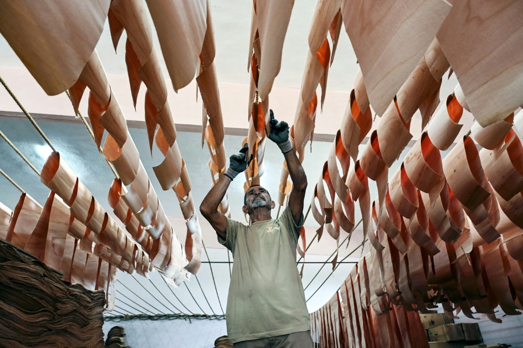 El aroma cálido y con notas dulces del cedro invade el local, ubicado en el municipio tabacalero de Cabaiguán, 380 kilómetros al este de La Habana. Largos pliegos de madera cuelgan en tendederos esperando secarse para la confección de las láminas.