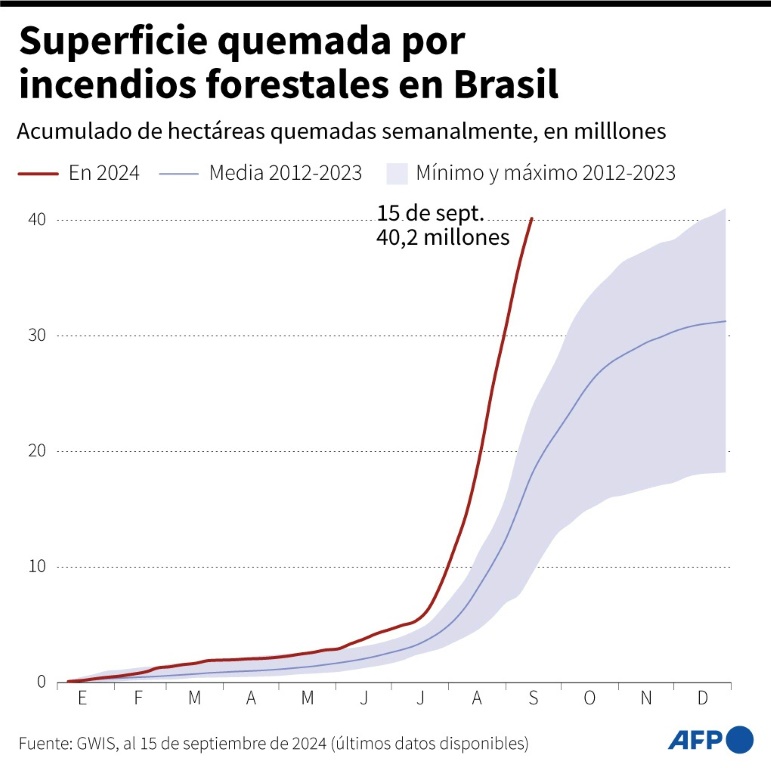 Los satélites del Instituto Nacional de Investigaciones Espaciales (INPE) detectaron 59.641 incendios en Brasil desde principios de septiembre, cifra que supera con creces el total de todo este mes registrado el año pasado (46.498).