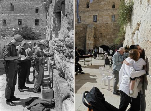 Combinación de fotos mostrando el muro de las lamentaciones durante la guerra de los seis días en junio de 1967, y gente rezando en la misma localización 50 años más tarde, en mayo de 2017 afp_tickers
