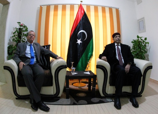El presidente del Parlamento libio reconocido por la comunidad internacional, Aguila Saleh, posa junto al enviado especial de la ONU para este país, Martin Kobler, antes de una reunión en Shahat, Libia, el 31 de diciembre de 2015 afp_tickers