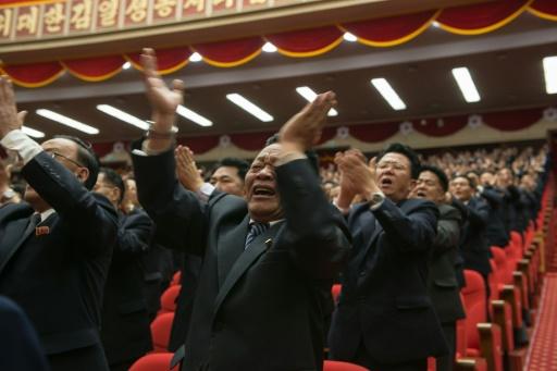 Mientras la música brotaba por los altavoces, los asistentes se levantaron y aplaudieron con fuerza al tiempo que Kim Jong-un, flanqueado por altos responsables, aparecía en el escenario.