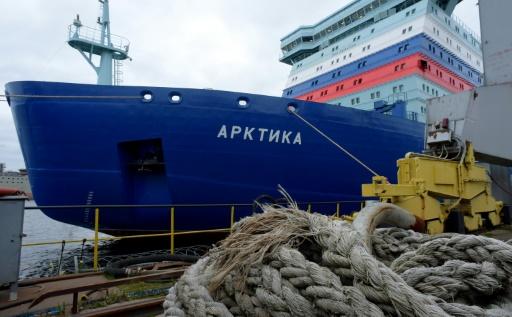 El rompehielos ruso "Arktika", de propulsión nuclear, se observa amarrado antes de abandonar el puerto de San Petersburgo el 22 de septiembre de 2020 para su viaje inaugural afp_tickers