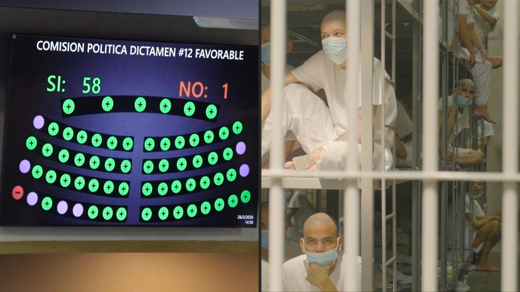 A propuesta de Bukele, la Asamblea Legislativa aprobó el 17 de marzo la prisión perpetua después de que oenegés lo señalaron de cometer «crímenes de lesa humanidad» en lucha contra la delincuencia.