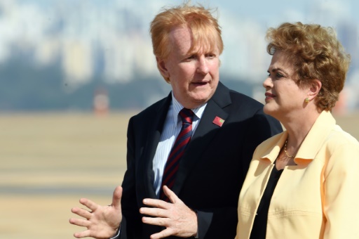 La presidenta de Brasil Dilma Rousseff (d) junto al presidente de Seguridad y Defensa de Embraer en la presentación del Embraer KC-390 en la base aérea de Brasilia el 5 de marzo de 2016 afp_tickers
